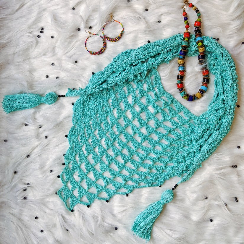 The JuJu scarf is a Lacey, Light weight, summery crochet triangular scarf which will be the perfect accessory to any outfit and style.The scarf pattern is availble in instructions for Fingering weight yarn as well as DK weight yarn.
