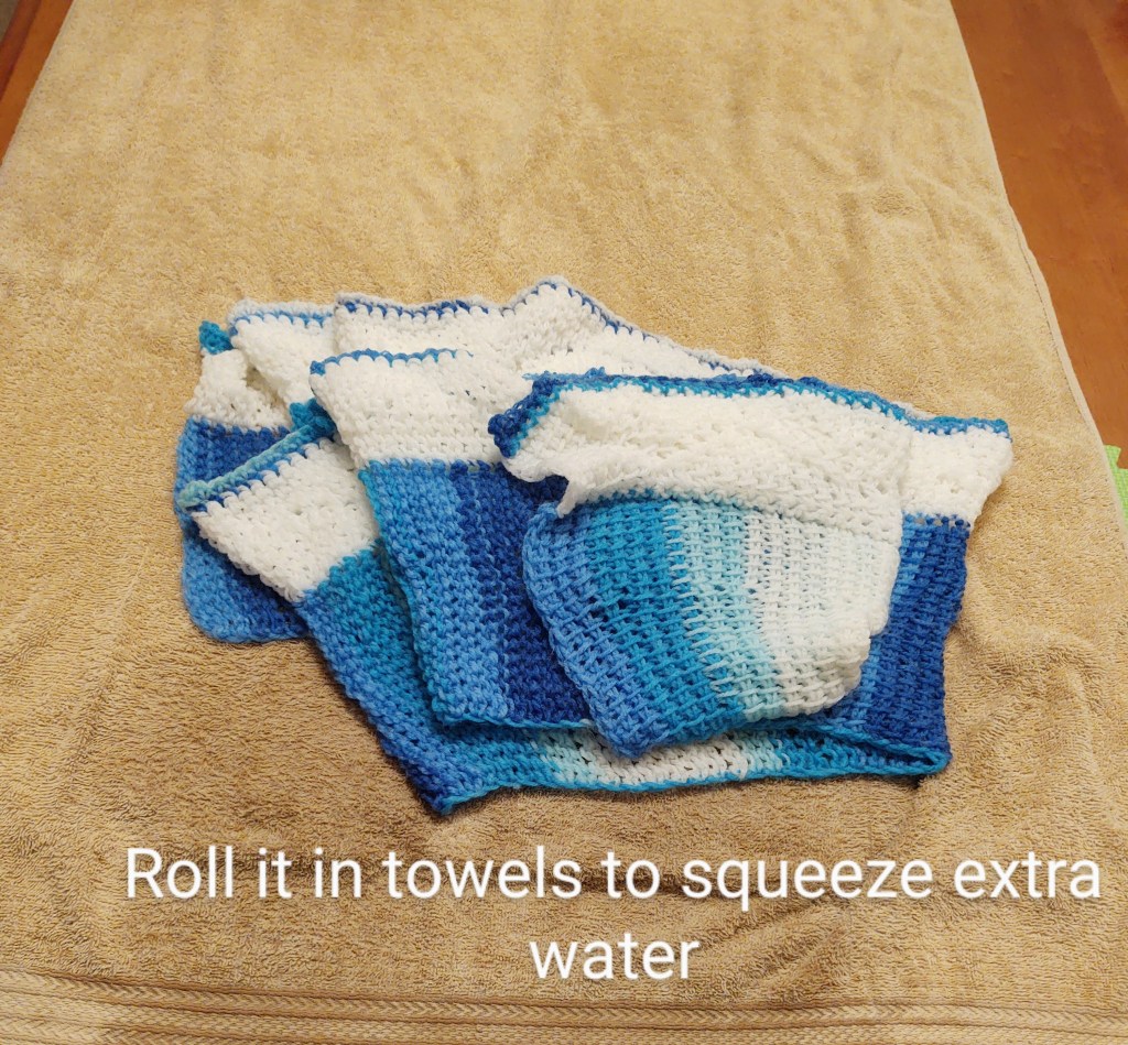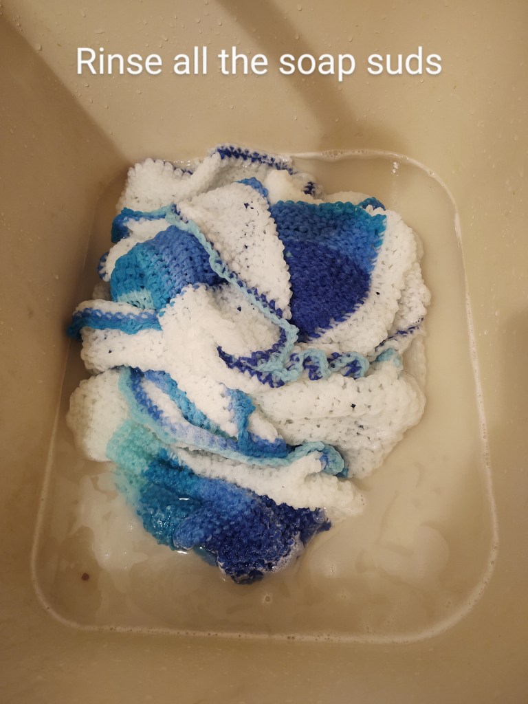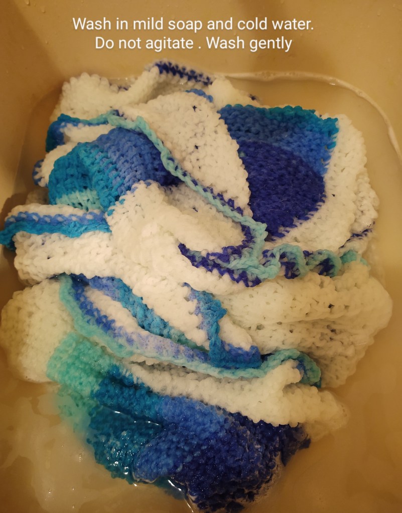 For acrylic you will gently wash the handcrafted piece in cold water and mild detergent. A few drops of the handwash soap or mild shampoo will do the trick. Rinse in water till the soap suds are removed. Do not wring( twist) the project to remove excess water. Squeeze out as much water as you can.