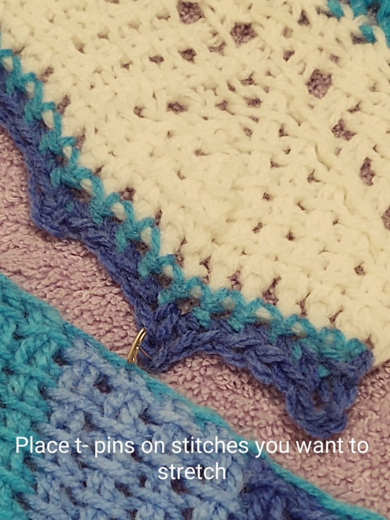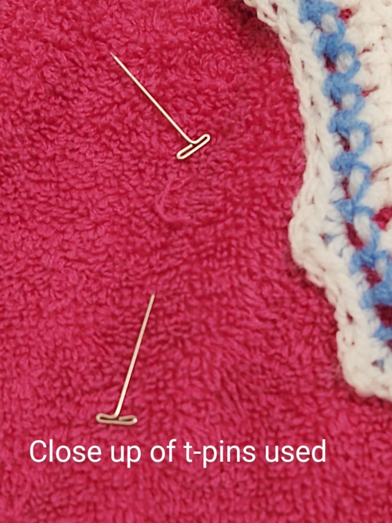 You will now take your t-pins and pin the points you want to be stretched. Usually one places the t-pins on the picots .