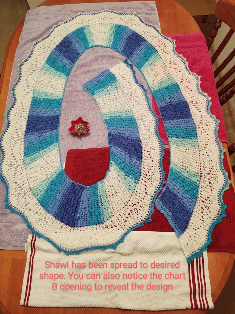 After completing chart B, you should have finished with one row of single crochet. You should have 451 sc.
