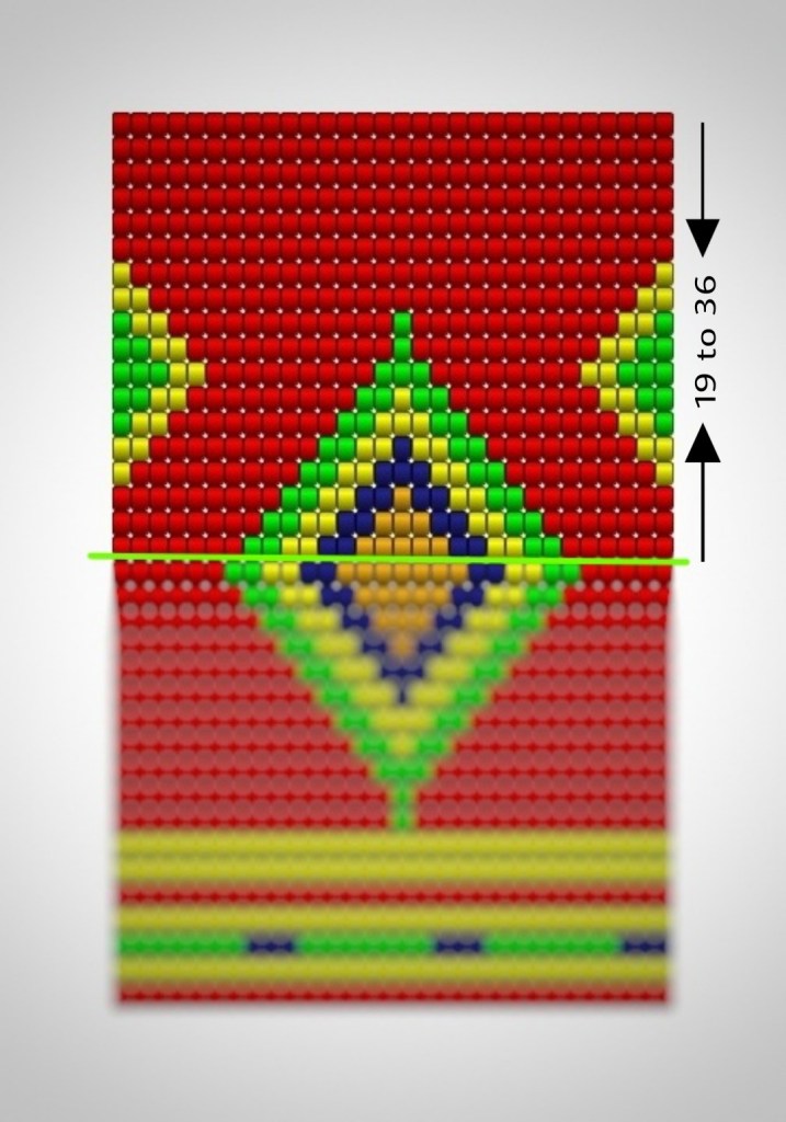 20 stitches before the end, cut yarn color E. 15 stitches before the end, cut yarn color D. 10 stitches before the end, cut yarn color B. At the end of the Row, cut yarn colorA.