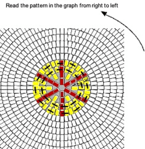 Black colour dash across two blocks indicates increase in stitches. 6 stitches in the magic circle is not counted as a Row.