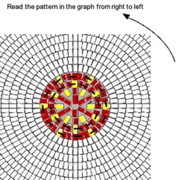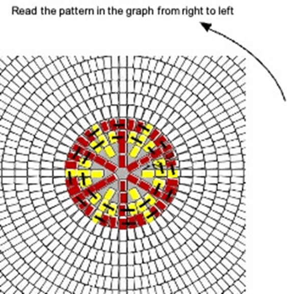 In this chart, red blocks are yarn colour A and yellow ones colour B